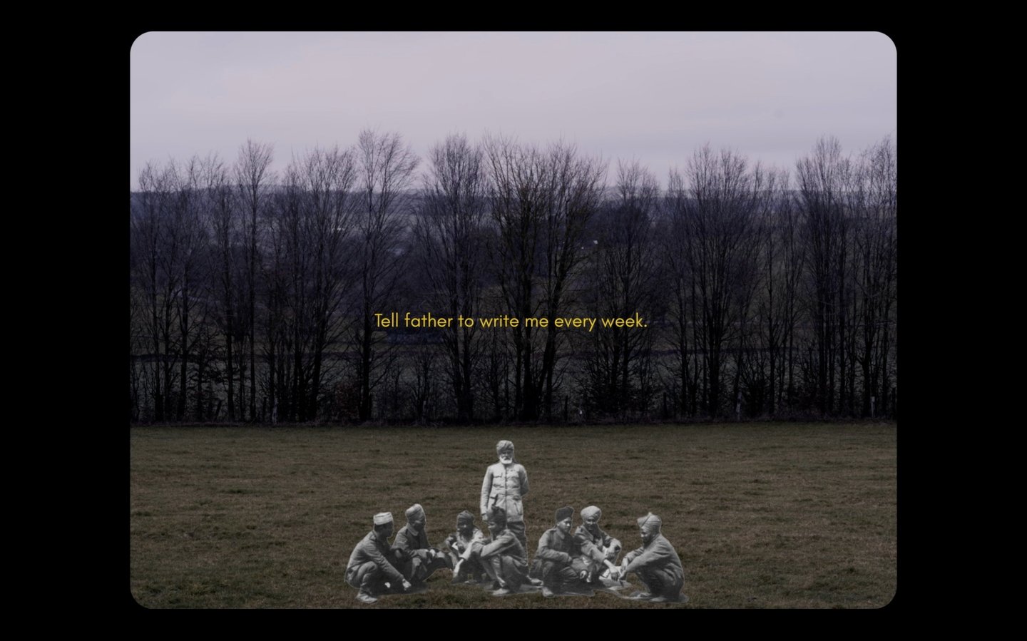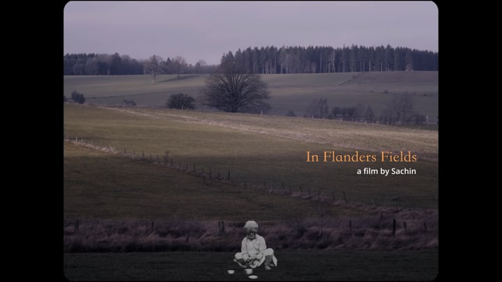 While visiting Ypres, Sachin learns that 1.4 million Indians were conscripted by the British to fight on the Flanders Fields during the First World War. Using audio recordings, letters, songs and archives, he brings his anonymous ancestors back to life, like ghosts inlaid in an immovable winter landscape.